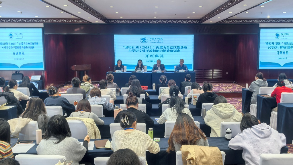 10月20日,由内蒙古自治区中小学幼儿园教师培训项目执行办公室主办、呼伦贝尔学院承办的“国培计划(2025)”内蒙古自治区旗县级小学语文骨干教师能力提升培训开班典礼正式举行。我校党委委员、副校长李跃武,继续教育学院院长莎茹莉、副院长汪鑫,海拉尔区教育研修中心小学教研室主任由秀芳及授课专家团队和来自全区12个盟市的100名小学语文骨干教师共同参加开班典礼,开班典礼由汪鑫主持。据悉,本期培训将持续14天,旨在通过系统研修与实践打磨,助力旗县级小学语文骨干教师提升专业能力,推动区域基础教育质量升级。