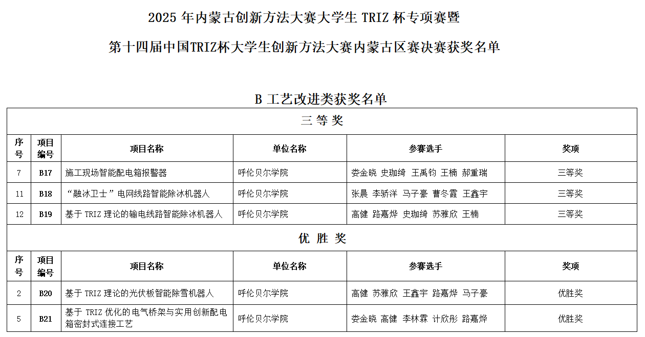 10月25日至26日,2025年内蒙古创新方法大赛大学生TRIZ杯专项赛暨第十四届中国TRIZ杯大学生创新方法大赛内蒙古区赛决赛在呼和浩特市举行。我校工学院组建19支学生参赛队伍,在与全区高校优秀团队的激烈角逐中全部成功突围,一举斩获19项大奖,创下我校在该赛事中的获奖数量最多、名次级别最高的历史性战绩,为学校赢得荣誉。