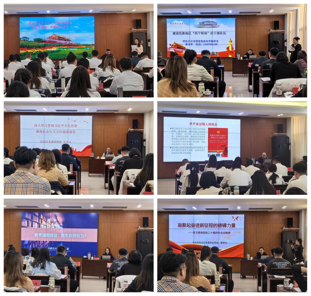 本次培训紧扣年轻干部成长需求,课程设置科学合理,教学内容丰富实用。特邀内蒙古党校党史党建教研部主任孙杰教授,内蒙古党校政治学教研部主任庄虔友教授,内蒙古大学社会科学处处长许晋教授,自治区党委讲师团副团长吴东风,市委党校经济学教研室崔学才教授,呼伦贝尔市委党校政治学教研室姜永军副教授,分别围绕习近平总书记党建思想、文化思想、习近平谈治国理政、党的二十届四中全会精神、教育强国青年何为、民族地区“四个特别”好干部等内容进行了精彩的专题授课。培训期间,创新开展“以乐传情守使命 以誓明志践初心”沉浸式音乐党课,通过艺术形式让学员们重温入党誓词,感悟初心使命。本次专题研讨班围绕“如何提升专业能力与履职本领,更好地服务学校中心工作”开展研讨,学员们结合工作实际深入交流,相互启发,共同提高。
