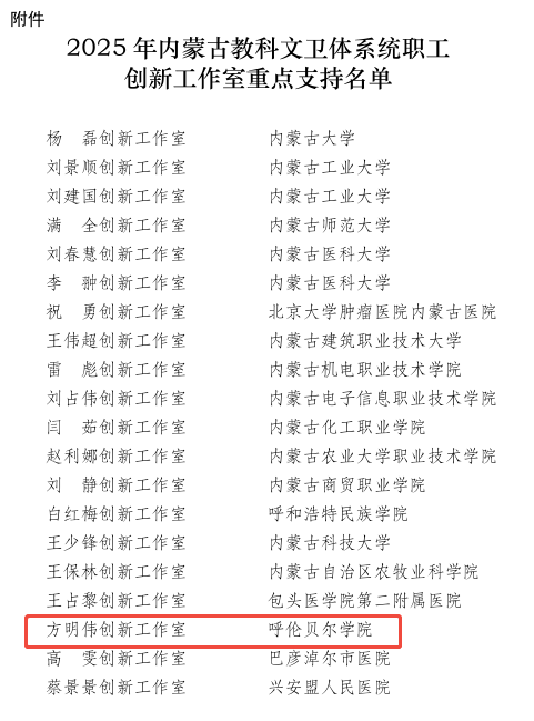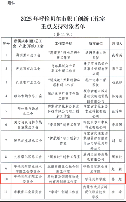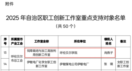 近日,我校肖燕子领衔的饲草栽培与加工高效利用创新工作室荣获2025年度内蒙古自治区总工会重点支持职工创新工作室、方明伟创新工作室入围内蒙古自治区教科文卫体系统2025年重点支持职工创新工作室名单、姜超创新工作室获批2025年呼伦贝尔市总工会重点支持的创新工作室。此次3项荣誉的斩获,既是对我校工会职工创新工作的高度认可,更标志着我校在服务地方发展、深化教学科研改革、凝聚职工创新活力方面迈出了坚实步伐。截至目前,我校已拥有自治区级创新工作室2个、自治区教科文体工会系统创新工作室2个、市级创新工作室5个,形成了多层次、全覆盖的职工创新培育体系。
