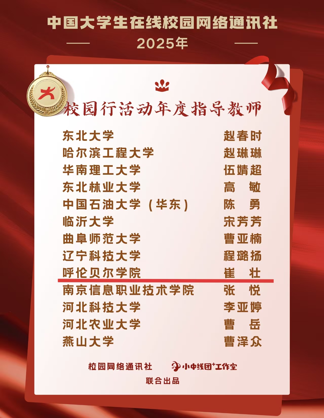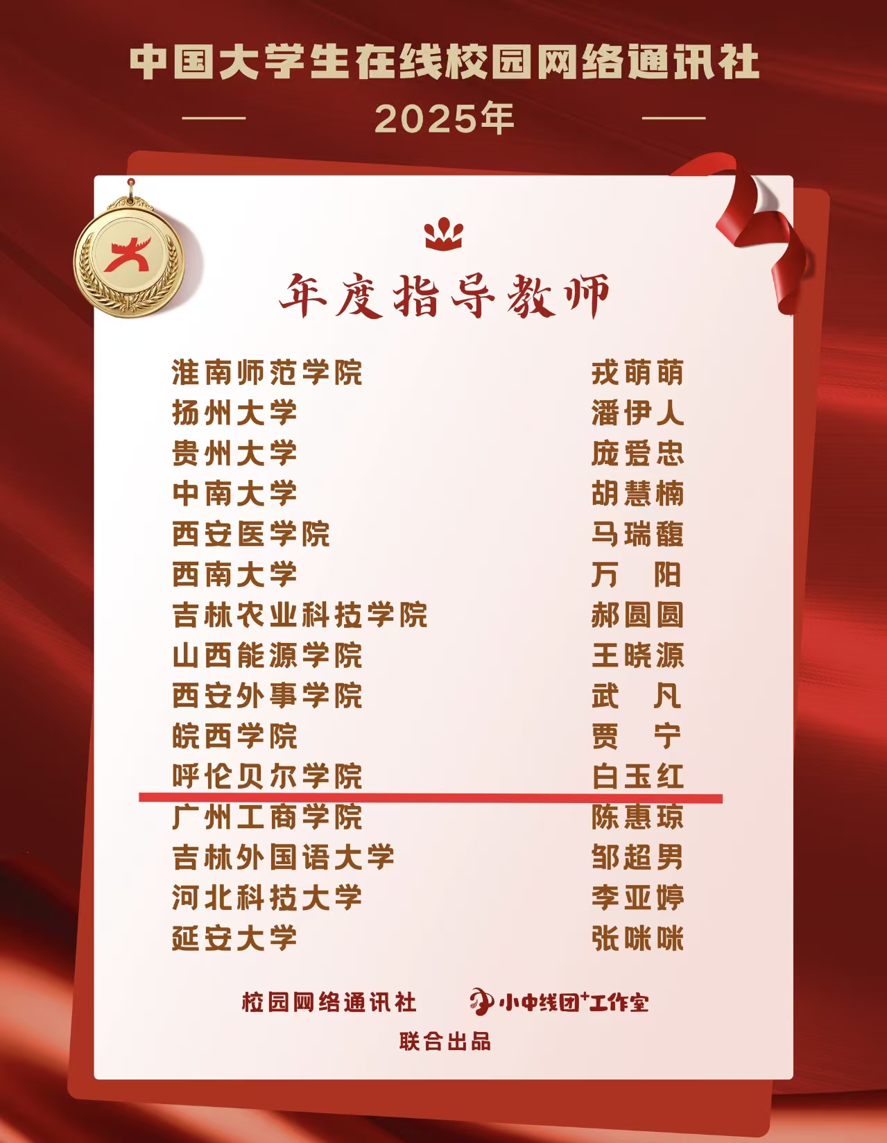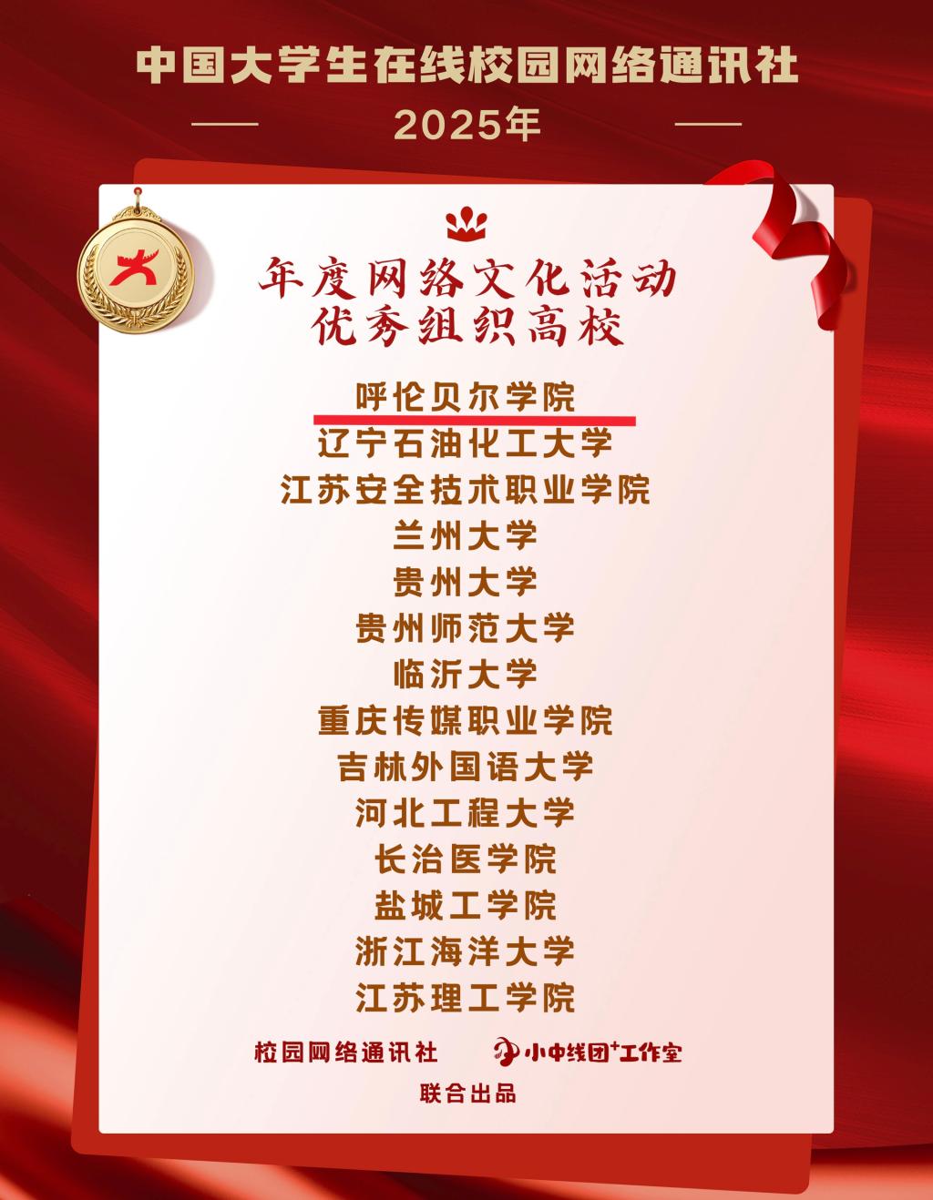 呼伦贝尔学院获评“年度网络文化活动优秀组织高校”“年度校网通站”,白玉红获评“年度指导教师”,崔壮获评“校园行活动年度指导老师”,杨佳、刘小雪获评“年度学生通讯员”。自2020年6月入驻平台以来,我校已连续5年累计斩获27项荣誉。