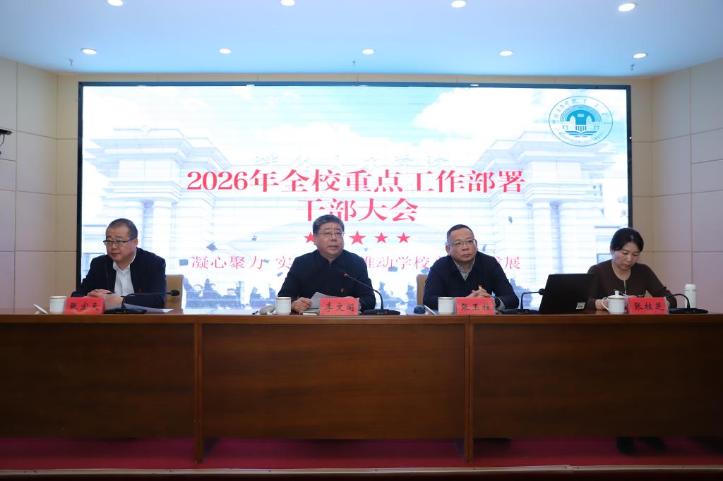 会上,校党委副书记、校长张玉柱对2026年全校重点工作进行系统部署。他指出,2026年是学校承前启后、谋求高质量发展的关键一年,全校上下要紧扣“升大申博”目标,坚持“聚焦一个目标,坚持两个引领,建设三支队伍,深化四项合作,推进五项攻坚”工作思路,抓实抓细九大重点工作。一是狠抓校园安全,守牢发展底线;二是坚持思政铸魂,深耕立德树人,筑牢人才培养根本根基;三是坚持规划引领,锚定发展目标,加快应用型特色高校建设步伐;四是坚持改革创新,聚焦质量提升,全面增强人才培养核心竞争力;五是坚持人才强校,引育留用并举,建强新时代高素质师资队伍;六是坚持科研赋能,聚焦成果转化,提升服务地方发展能力;七是坚持开放合作,深化协同联动,构建共赢发展新格局;八是坚持精细管理,强化服务保障,推进治理能力现代化;九是坚持党建引领,强化政治保障,推动学校事业内涵式发展。他强调,全校各级干部要发挥示范引领作用,带头担当作为,将各项任务分解到岗、落实到人,以实干推动学校各项事业再上新台阶。