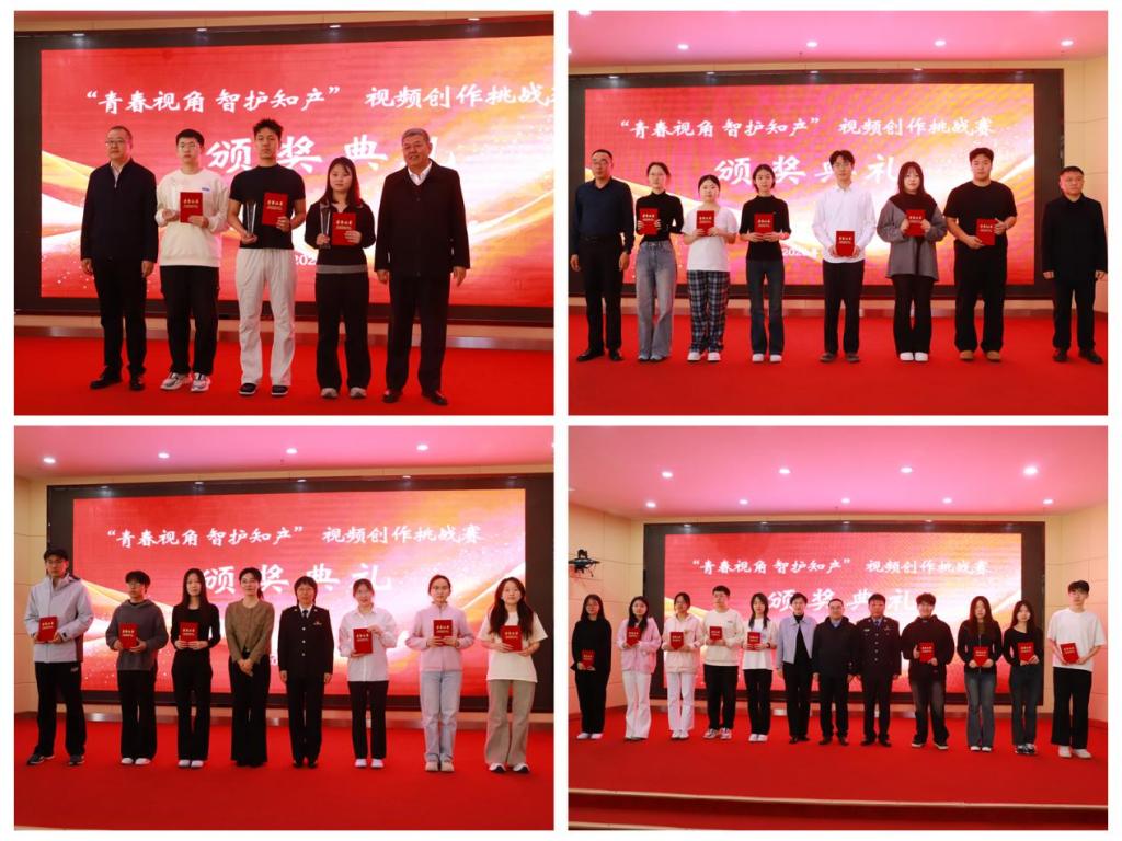 作为宣传周亮点活动,“青春视角·智护知产”视频挑战赛三大板块共征集作品142份。其中,我校57份作品进入终审,斩获一、二、三等奖多项。与会领导为获奖选手代表颁奖。