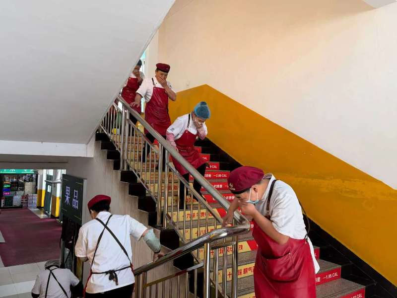 演练围绕消防应急、急救技能、食品安全三大重点工作展开。消防环节,安保人员讲解灭火器、灭火毯使用方法与适用场景,示范食堂重点区域灭火操作,并组织火灾应急逃生演练,指导员工规范疏散、快速避险。急救环节,后勤管理处医务室医护人员现场教学海姆立克急救法、心肺复苏及外伤包扎固定等方法,逐一纠正操作细节,提升人员应急救护能力。食品安全环节,通过实景模拟事故上报、现场处置、留样封存、全面消杀等流程,规范应急处置程序,强化协同处置水平。