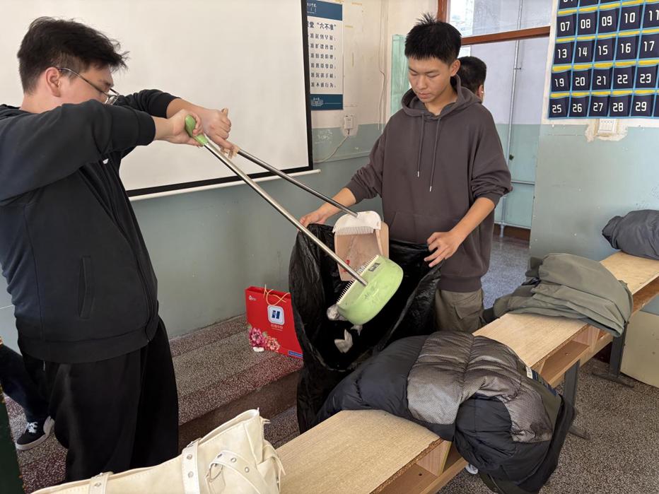 在室外分担区,同学们重点对道路两侧和绿化带内的落叶、纸屑等垃圾进行细致捡拾;与此同时,教室内的清扫工作也在有序进行,学生们分工明确,有的擦拭门窗、座椅和讲台,有的排列课桌、擦拭黑板;在学生宿舍区域,同学们对个人床铺、地面进行了彻底打扫。大家主动整理内务,清理堆放杂物,确保宿舍通风干燥、干净卫生。