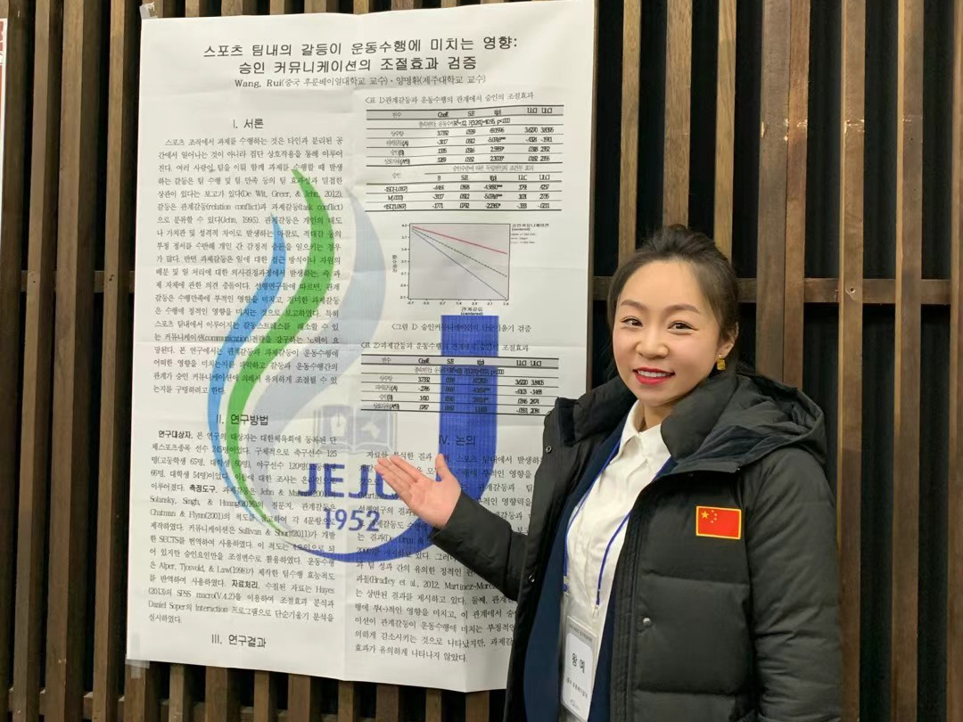 王瑞长期深耕在体育学领域的研究一线,发表了一系列研究成果。在韩国留学期间,她被聘任为韩国教练能力开发研究院济州中心的副会长,曾多次受邀参加相关会议。在本次会议中,王瑞发表了题为《中国留学生运动参与水平与学校生活满意度的关系:运动投入的调节作用》的论文,并参与了“体育及教练现场对话”环节,与国际专家展开热烈研讨,就冰雪运动经济与训练方法等前沿问题展开交流,进一步拓展了国际合作与科研视野。王瑞在会议期间的专业表现,受到了学者们的一致好评,充分展现了我校教师良好的精神风貌、科研素养与国际影响力,为我校在国际学术交流与教学科研提质等方面注入了前沿动力。