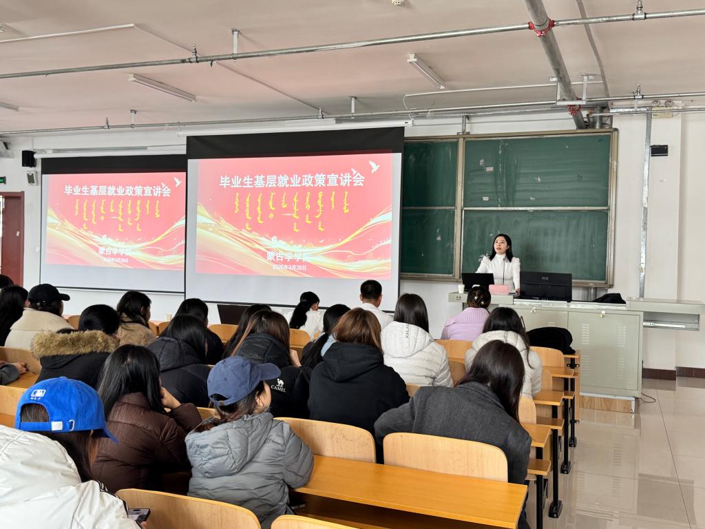 为深入贯彻落实国家关于引导高校毕业生面向基层就业的决策部署,帮助学生全面了解基层就业相关政策,明晰基层就业发展路径,树立正确的就业观与择业观,3月28日上午,蒙古学学院开展了毕业生基层就业政策专题宣讲会。本次宣讲会邀请教育学院教师阿那巴达主讲,学院团学办副主任乌日汉主持,学院党委副书记孔春艳、毕业班辅导员以及学院2022级、2023级全体学生参加。