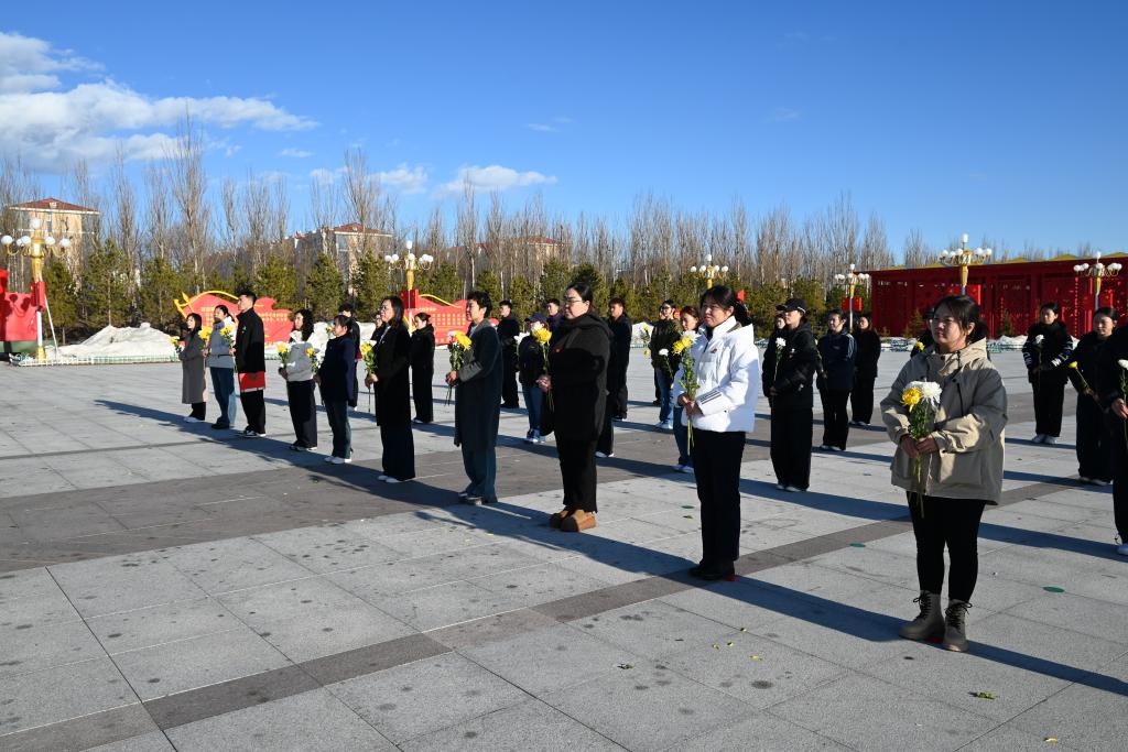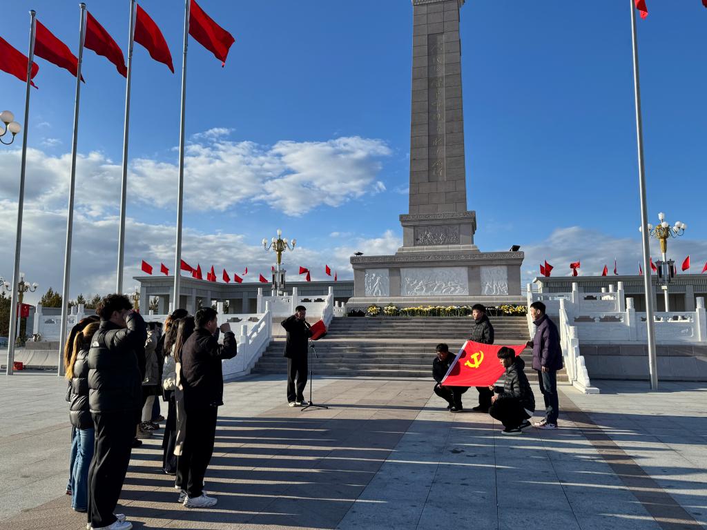 下午,全体人员在学校集合,徒步前往呼伦贝尔市人民英雄革命烈士纪念广场。途中,带队教师深情讲述革命先烈事迹与蒙古马精神的时代内涵,让大家在行进中接受红色洗礼。到达目的地后,活动正式开始。纪念广场内松柏苍翠、庄严肃穆,烈士纪念碑巍峨矗立,镌刻着革命先烈为民族独立、人民解放和国家富强英勇献身的崇高精神。全体人员整齐列队、垂首肃立,在激昂雄壮的国歌声中拉开祭奠序幕,接着集体默哀三分钟,深切缅怀为民族解放事业、为边疆稳定发展抛头颅、洒热血的革命先烈,表达对英烈的无限追思与崇高敬意。默哀结束后,全体人员依次上前,向烈士纪念碑敬献鲜花、鞠躬致敬,驻足凝视、静默追思。随后,师生党员面向鲜红的党旗,高举右拳,重温入党誓词,铿锵有力的誓言回荡在广场上空,既是对革命先烈的庄严告慰,更是全体党员坚守初心使命、践行责任担当的郑重承诺。学院党委书记在总结讲话中强调,此次主题党日既是一次深刻的爱国主义教育和党性洗礼,也是一次思想动员和行动部署。全体党员要以此次活动为契机,一是要铭记英烈事迹,传承英烈精神,从革命先烈的光辉历程中汲取精神养分,筑牢信仰之基、补足精神之钙;二是要深化思想认识,坚持实事求是、真抓实干;三是要立足学院特色,聚焦学科建设、非遗传承、民族团结进步等重点工作,以“功成不必在我、功成必定有我”的精神境界,推动学院各项事业高质量发展。